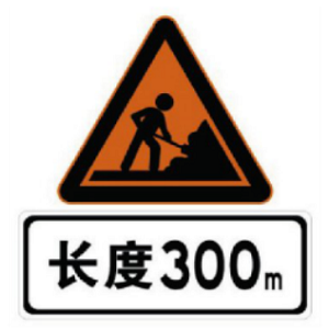 第二類是作業區長度標志,此類標志告知駕駛人員緩行路段長度;標志牌使用橙色反光膜做為底膜,圖案部分與邊框使用黑色反光膜制作,搭配一塊長度距離的輔助標志一起安裝。